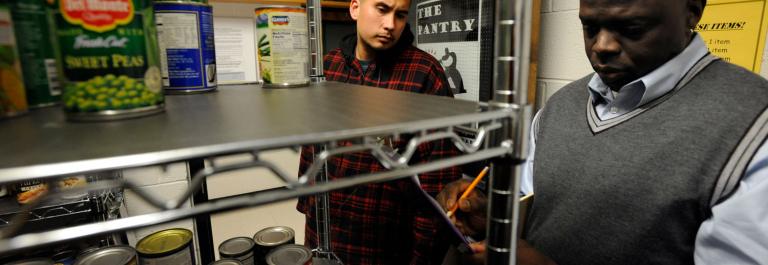 <p>Survival Training Coach for Pikes Peak Community College, Eddie Hughes, right, takes care of paperwork with student Dan Bahlen during a trip to the school pantry. Bahlen, 29, an American Indian, Apache, is fighting his way through college after spending nearly ten years homeless in Colorado Springs. He currently lives in an apartment and is a full-time student at PPCC. Photo By Andy Cross/The Denver Post via Getty Images.</p>
