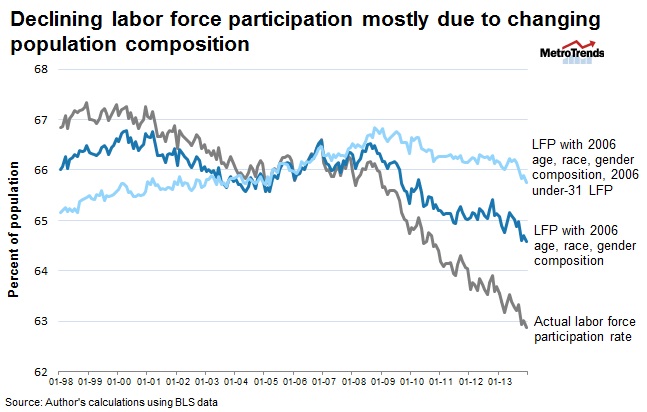 The darker blue line below is a hypothetical labor force participation rate; it holds the population’s composition (age, race, gender) constant at 2006 levels since 1998, while letting the participation rate vary. It shows that, after the recession, the rate would only have fallen by about one percentage point, rather than the actual drop of more than three percentage points. In other words, the changing population accounted for two-thirds of the post-recession drop.