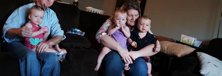 <p>Adam Archibeque, left, who was let go from a downsizing oil field operator, sits in his home with his wife Misty and three of their four children on March 27, 2015 in Portland, Texas. Archibeque and his wife Misty recently had quintuplets, making his current unemployment even more costly. Photo by Spencer Platt/Getty Images</p>