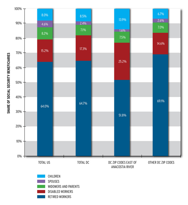 Last month in MetroTrends, Margaret Simms pointed out that Social Security is more than a retirement program since it also provides income support to disabled workers and the dependent spouses and children of retired, disabled, or deceased workers. Let me second her point that Social Security is vital for many households whose benefits comprise much or, in some cases, all their income. And let me show you what this means in my hometown—Washington DC.