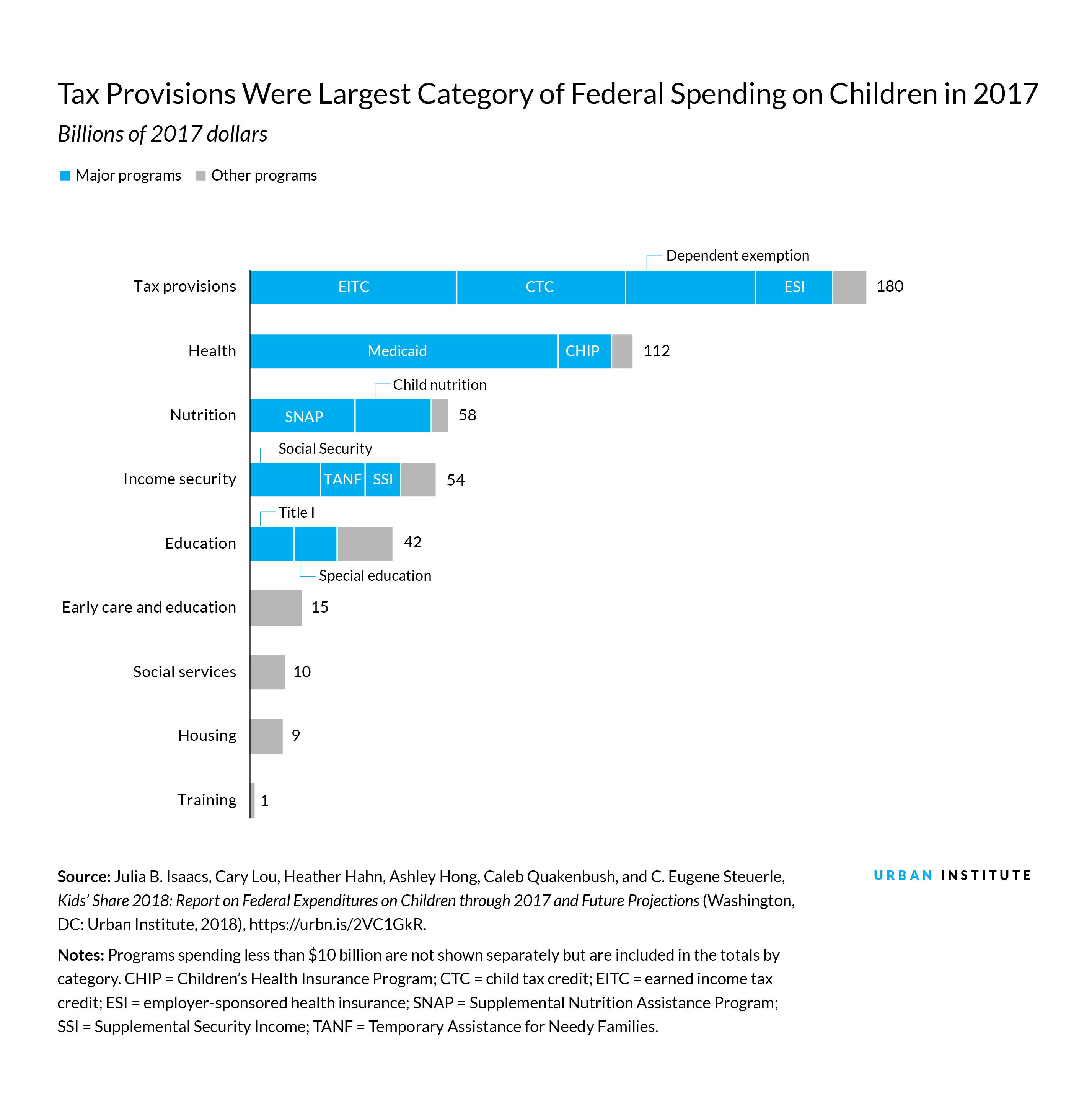 When counted together, tax provisions that benefit children far exceed any other major budget category of spending, according to the Urban Institute’s annual Kids’ Share report. Expenditures on tax provisions totaled $180 billion, or 37 percent of total 2017 federal expenditures on children.