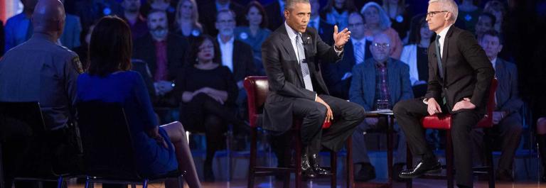 <p>President Barack Obama, center, answers questions during a CNN televised town hall meeting hosted by Anderson Cooper, right, at George Mason University in Fairfax, Va., Thursday, Jan. 7, 2016. (AP Photo/Pablo Martinez Monsivais)</p>
