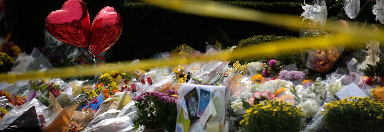 <p>Flowers lay on the ground at a memorial outside the Tree of Life Synagogue on October 31, 2018 in Pittsburgh, Pennsylvania. Eleven people were killed in a mass shooting at the Tree of Life Congregation in Pittsburgh's Squirrel Hill neighborhood on October 27. (Photo by Jeff Swensen/Getty Images)</p>