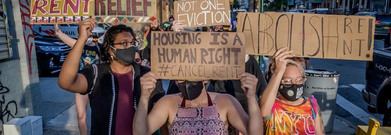 <p> Protesters march and hold signs at a protest on July 1, 2020, in Brooklyn, New York. Tenants and Housing Activists dropped banners from their buildings and organized a march in the streets of Bushwick demanding the city to cancel rent immediately. (Photo by Erik McGregor/LightRocket via Getty Images)</p>