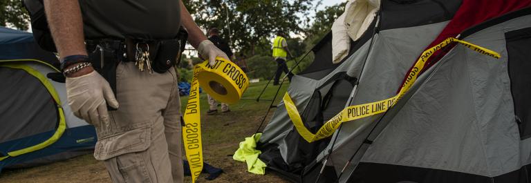 When police respond to homelessness, they frequently issue move-along orders or arrests and citations for sleeping or camping. This criminalization of living outside leads to a homelessness-jail cycle, which does nothing to improve the lives of people without homes or the broader community. Encampment sweeps can also traumatize people living there and interrupt their efforts to build stability.