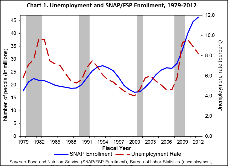It is no secret that SNAP played a vital role in assisting families during the recession. SNAP enrollment increased by about 80 percent during the recession. That SNAP would grow during the recession is not surprising as SNAP enrollment has generally followed the unemployment rate, dating back to the 1970s (see chart 1). What stands out is a particularly sharp increase beginning in 2007, coinciding with huge spikes in unemployment and the start of the Great Recession.