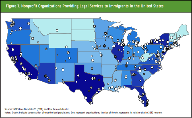 An analysis of data from the National Center for Charitable Statistics indicates at least 684 nonprofits provide some form of legal aid to immigrants. These providers are dispersed throughout the United States and can be found where immigrant communities have settled.