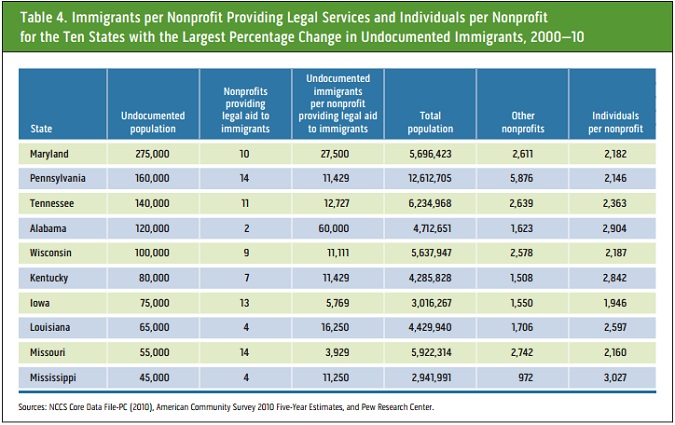 In the top 10 states with the largest percentage change in undocumented immigrants, nonprofits that provide legal services to immigrants potentially have a larger population to serve compared to other nonprofits. For instance, in Maryland, the ratio of nonprofits that provide legal aid to immigrants to potential undocumented clients in 1 to 27,500. In contrast, the ratio of other nonprofits to the general population is 1 to 2,182. Alabama is a stark case, where the two nonprofits that provide legal services to immigrants could face an estimated 120,000 undocumented individuals.