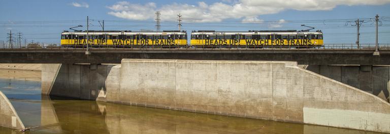 <p>Los Angeles Metro Rail along Los Angeles River, Long Beach, California, USA. (Photo by: Citizens of the Planet/Universal Images Group via Getty Images)</p>