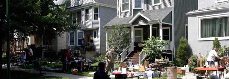 <p>People attend a yard sale in Logan Square as Housing Choice Partners real estate specialist Jessie McDaniels (not pictured) drives Section 8 voucher holders to the Logan Square and Lakeview neighborhoods to view apartments in Chicago, Illinois June 27, 2015. Photo by Joshua Lott for the Washington Post via Getty Images</p>
