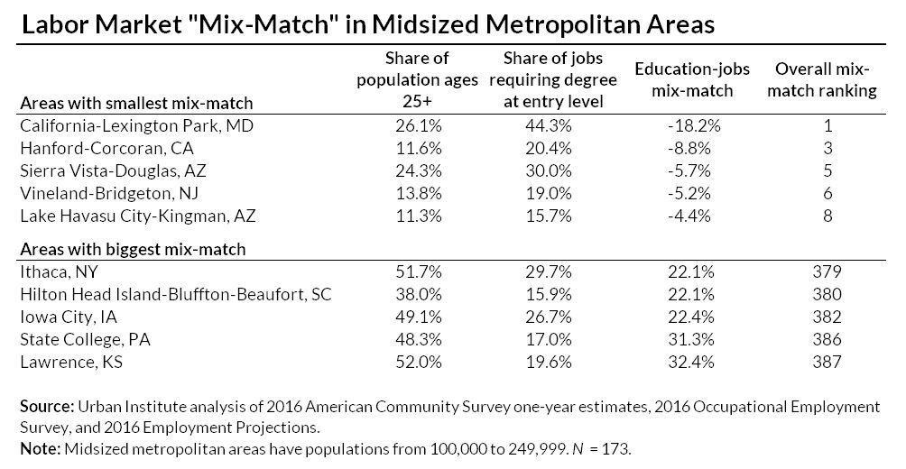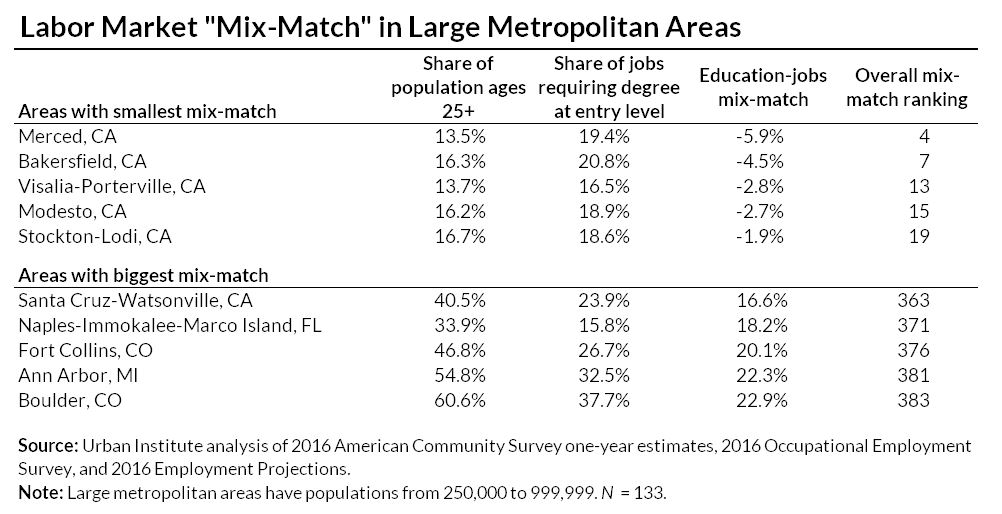 Many top-ranking metro areas, or ones with smaller mix-matches, have small shares of college graduates, including agricultural communities in the California San Joaquin Valley; postindustrial areas like Danville, Illinois; and vacation destinations like Lake Havasu City-Kingman, Arizona.