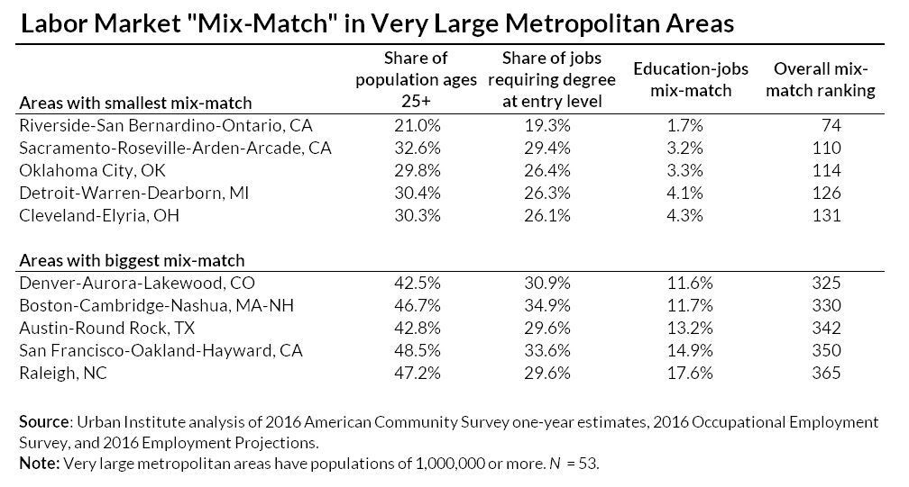 We also ranked metro areas by the size of the labor market mix-match. The top-ranking metro areas have a large share of jobs requiring a four-year degree relative to their college-educated populations. In these top-ranking metro areas with smaller mix-matches, people with a college degree likely have more opportunity to use that degree. In contrast, the bottom-ranking metro areas have bigger mix-matches where college educational attainment among local people outpaces the share of jobs that need it.