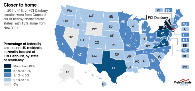 Yesterday, the Federal Bureau of Prisons (BOP) decided to allow female prisoners who hail from the region surrounding the Danbury Federal Correctional Institution to remain at the facility, where a new prison will be built to house the growing population. The decision is being heralded as a welcome reversal—and rightly so. Our analysis shows that 41 percent of women housed in Danbury—a location familiar to fans of Piper Kerman’s memoir and the popular Netflix series, Orange is the New Black—live in Connecticut or nearby northeastern states from Pennsylvania through Maine.