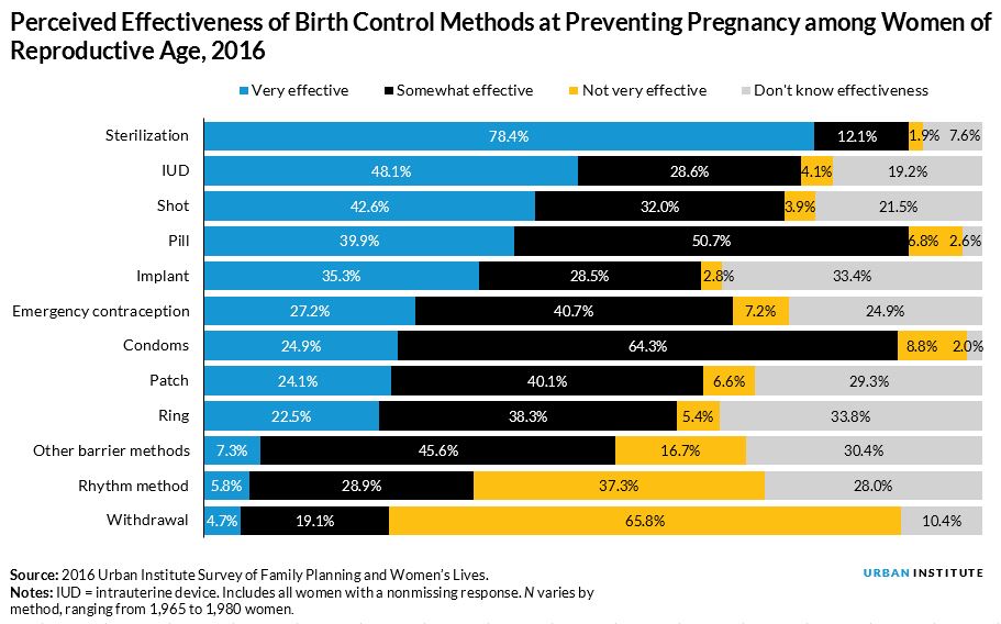 When asked about the effectiveness of different birth control methods, nearly 8 in 10 women reported that sterilization is very effective at preventing pregnancy, but women were less likely to consider other methods to be very effective. Intrauterine devices were considered the second-most-effective method, with 48 percent of women reporting that it is very effective at preventing pregnancy. Between 23 and 43 percent of women reported the shot, pill, implant, patch, and ring to be very effective. Only 6 percent of women viewed the rhythm method, or natural family planning, as very effective at preventing pregnancy.
