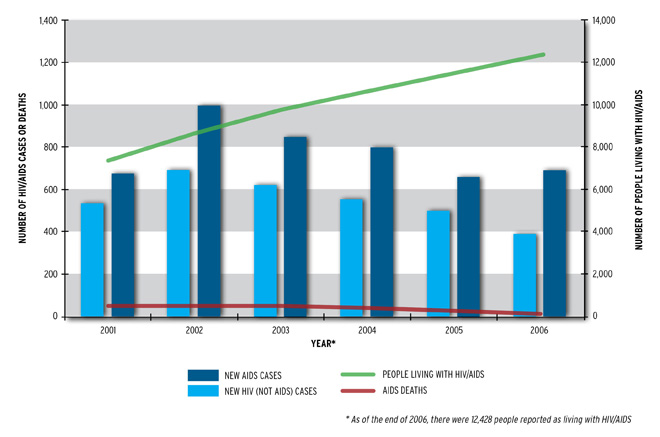 The UN report covers international statistics. Closer to home, there are also glimmers of progress in US cities where AIDS has been so prevalent. This graph from the District of Columbia Department of Health publication shows rates of people “living with AIDS” in six major cities – Baltimore, Chicago, Detroit, Philadelphia, New York, and Washington, DC – between 2001 and 2005. The good news in these numbers is that people are living. Medical advances have helped turn AIDS into a chronic disease instead of an immediate death sentence.