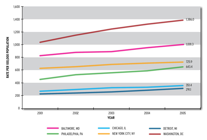 Rates for People Living With AIDS in the District of Columbia, Compared to Other Cities