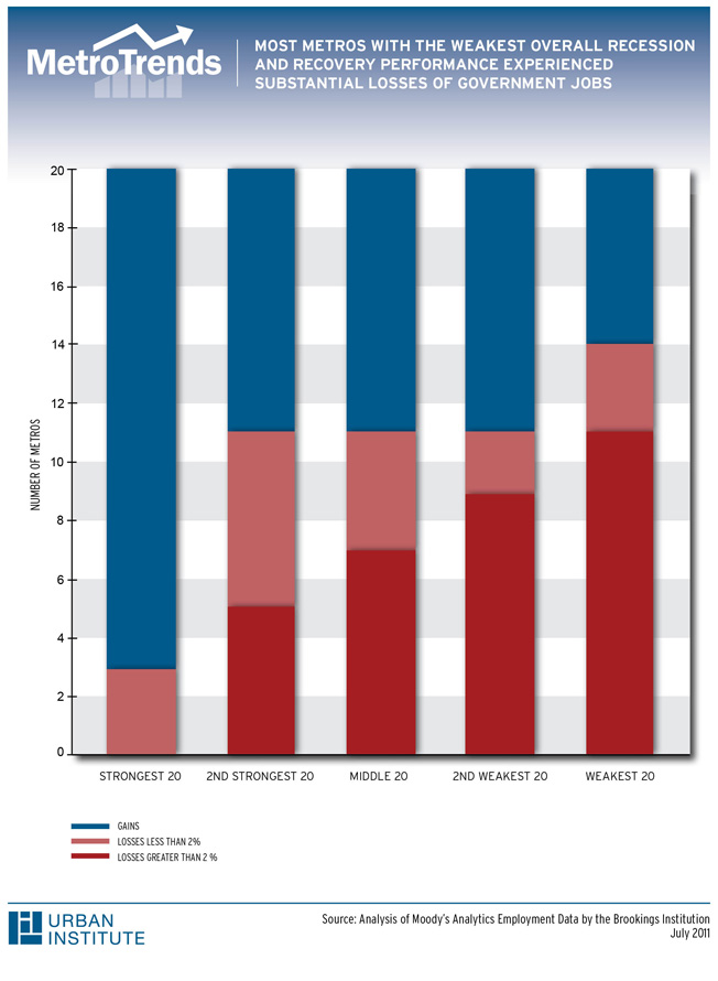 Nearly all the metropolitan areas whose economies suffered the least since the start of the Great Recession had increases in government employment, while most of those that suffered the most lost government jobs. Seventeen of the 20 metropolitan areas that have had the strongest overall economic performance since the start of the recession (all except Augusta, Buffalo, and Columbus) gained government jobs since their periods of peak total employment. Fourteen of the 20 that had the weakest overall performance (all except Bakersfield, Boise, Cape Coral, Jacksonville, Lakeland, and Tampa) lost government jobs since hitting their total employment peaks. For more, see the Brookings Institution MetroMonitor